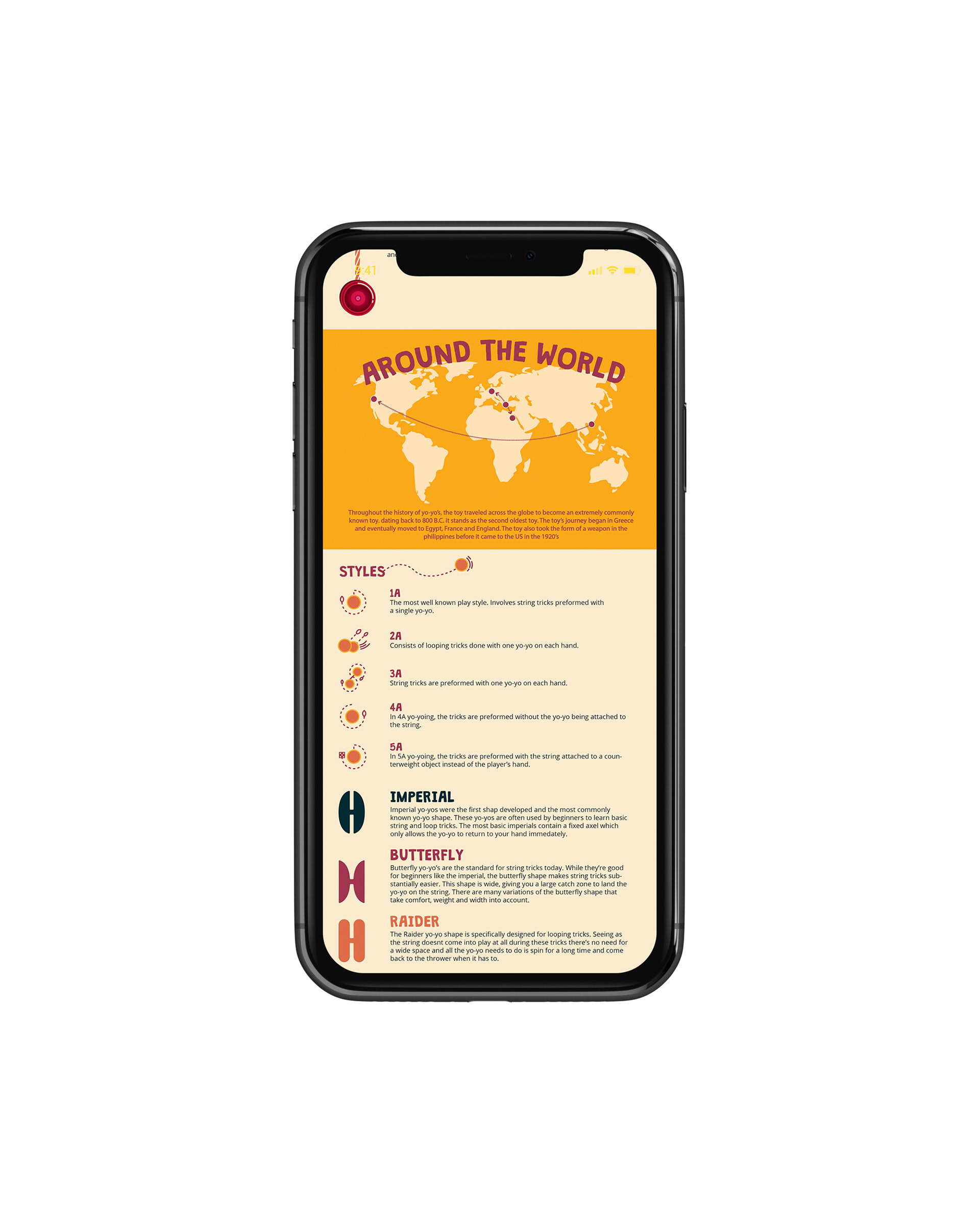 As someone whose been doing yo-yo tricks since middle school and is pretty knowledgeable on the subject, I decided there would be no better topic to create a data driven infographic for. It was a lot of fun creating the graphics and conceptualizing the visual styles displayed across both horizontal, vertical and motion graphics.